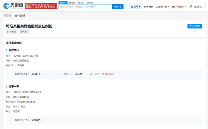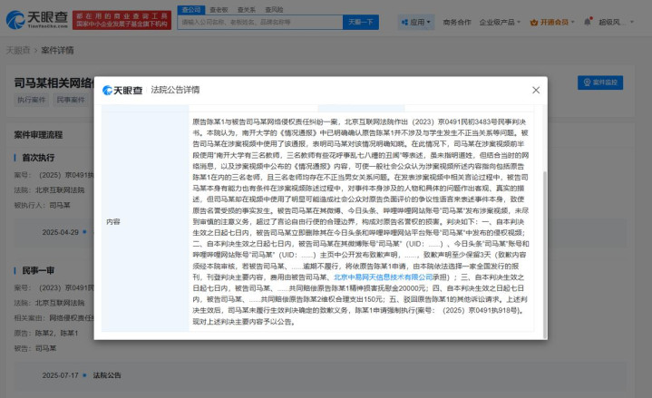 天眼查App显示,7月17日,因司马南未履行致歉义务,陈某某申请强制执行,北京互联网法院公告该案件判决书。案件流程信息显示,今年4月,司马南已因该案被执行2万余元。