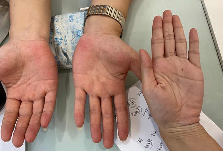 再看下图我这个患者,在一家国企里做管理,常年压力大、睡眠差,两个手掌就是偏红的,尤其是大小鱼际和指腹区域。这在中医看来是典型“心肝火旺”,火气上扰所致,她就是一个心肝火旺之人。