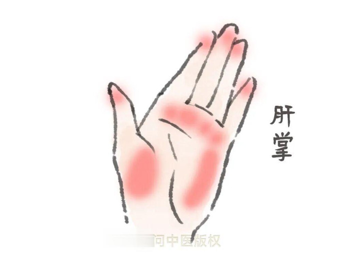 还有一种情况值得特别注意:如果大鱼际区域呈现出片状的红色斑点或斑块,一按压颜色就变淡,手一松又恢复红色,再加上小鱼际和指尖也类似表现,那就要警惕是不是“肝掌”了。