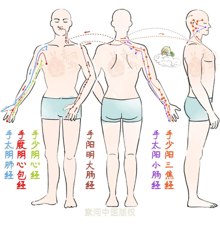 而三条阳经,大肠经、小肠经、三焦经,则从手走向头部。